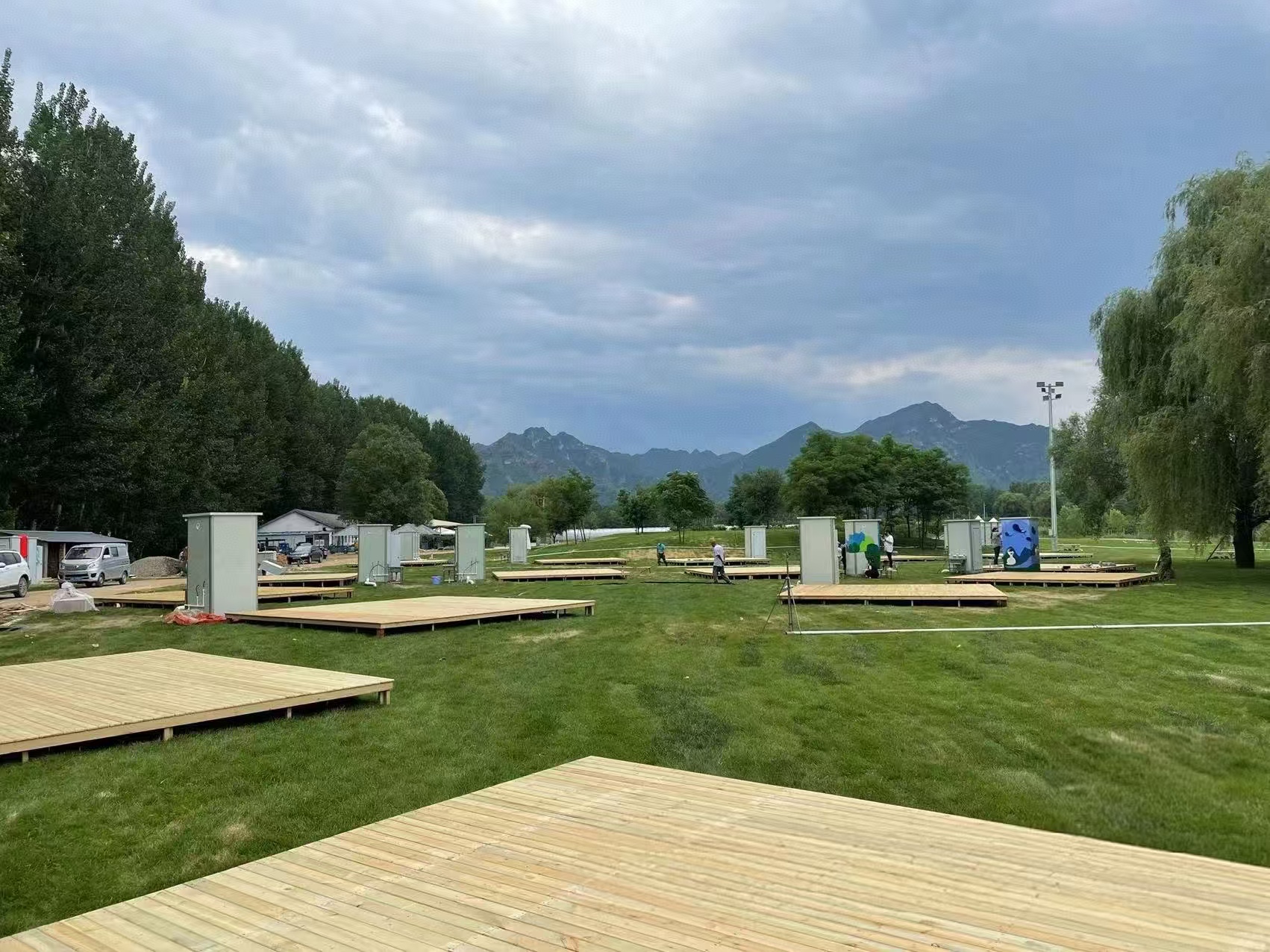 我们深筑防腐木工程在做这类项目时,会先看现场地形、排水方向、地面承重和平台高度。露营基地一般靠近草地、林地或水边,地面湿气比较明显,如果底部通风不好,木材长期闷在潮湿环境里,就容易影响使用状态。